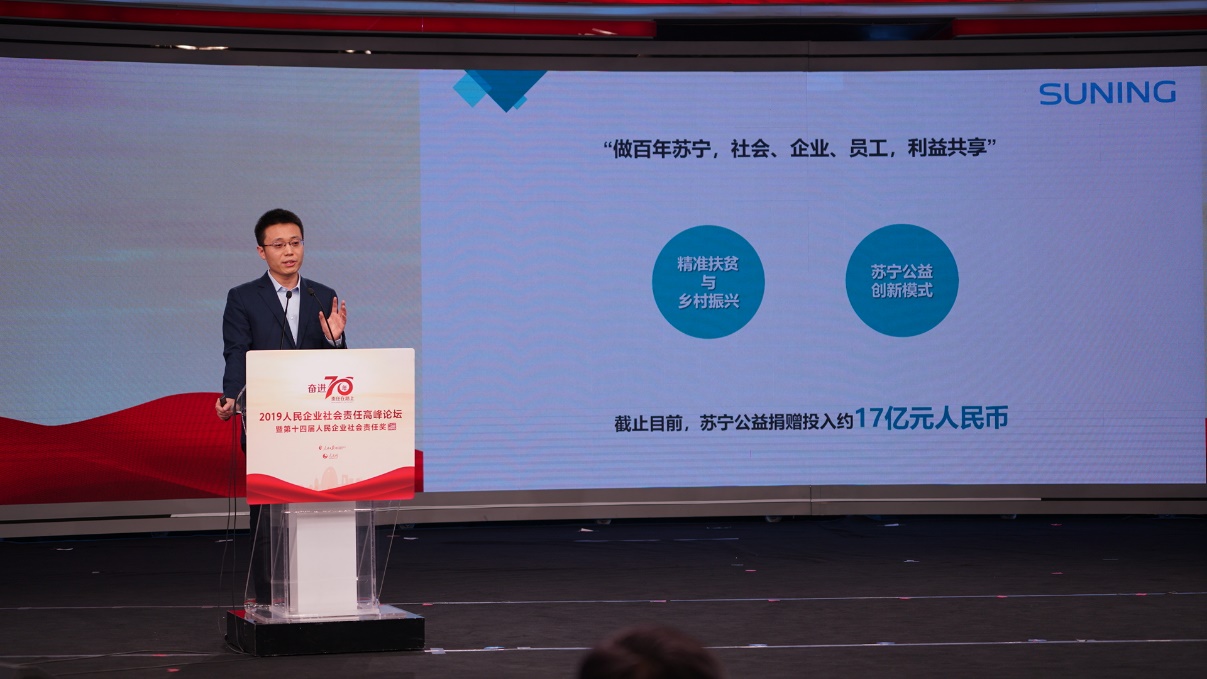 深圳新聞網(wǎng)2019年12月31日訊 12月27日,2019人民企業(yè)社會責(zé)任高峰論壇暨第十四屆人民企業(yè)社會責(zé)任獎(jiǎng)?lì)C獎(jiǎng)典禮在人民網(wǎng)舉行,各大企業(yè)代表分享經(jīng)驗(yàn)。蘇寧榮獲第14屆人民企業(yè)社會責(zé)任獎(jiǎng)“年度扶貧獎(jiǎng)”獎(jiǎng)項(xiàng),表彰蘇寧在扶貧領(lǐng)域深入、專業(yè)的投入,這也是蘇寧第七次獲得人民企業(yè)社會責(zé)任獎(jiǎng)。