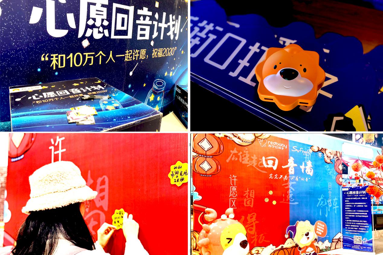 “心愿回音計(jì)劃”率先在南京徐莊園區(qū)啟動(dòng),蘇寧小店搭建起巨大的許愿瓶,瓶身通體為湛藍(lán)色,在藍(lán)色的背景中猶如海上漂流,并且內(nèi)置數(shù)不清的心愿球,許愿者可以在心愿球上寫出個(gè)人心愿,投回許愿瓶后等待圓夢(mèng),將會(huì)“和10萬個(gè)人一起許愿,祝福2020”。