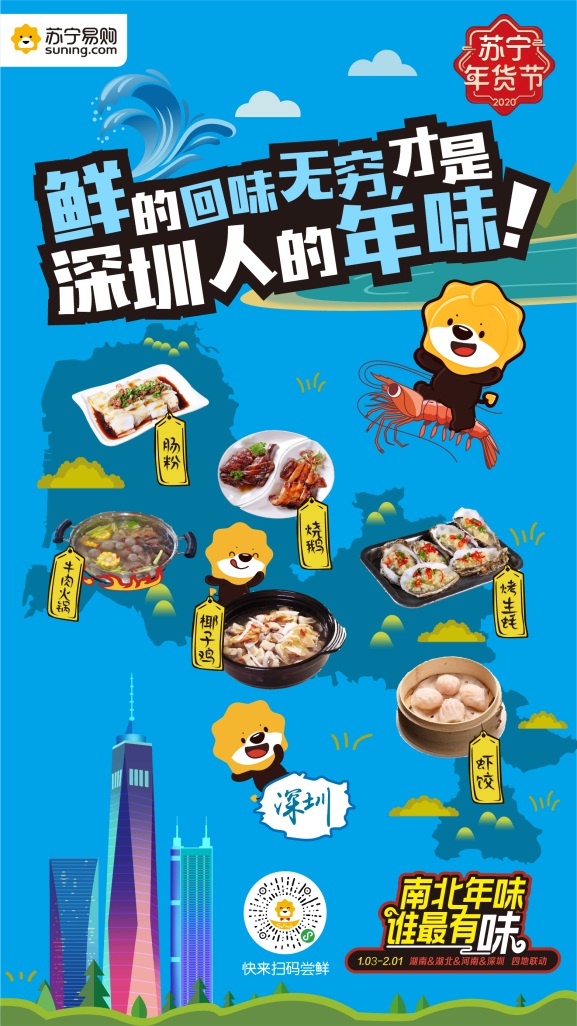 說起年味必提到年夜飯,中國地大物博每個城市的年夜飯各有特色,究竟哪個城市的年味最濃,各家眾說紛紜。為此華南、華中、華北具有代表性的四個城市紛紛站出來為各家城市的年味代言,深圳、武漢、長沙、鄭州四城分別從年味、年俗、年貨、方言等方方面面為消費者獻上了一頓年味大餐。那些記憶里存在的各色過年儀式,味覺里保留的故鄉(xiāng)味道,腦海里熟悉的地方鄉(xiāng)音,在這場年味比拼里一一重現(xiàn),喚醒了大家對于過年的期許,引發(fā)社交平臺上大家對于年味的分享。對于深圳這個移民大城往往被貼上沒有特色年貨的標簽,其實不然,作為嶺南文化重要傳承地的深圳擁有眾多特色年俗。并且隨著越來越多的人選擇春節(jié)留在深圳過年,深圳的年味也越來越濃,因此深圳蘇寧在本次南北年味的話題中,不斷深挖深圳年味,打造了一張?zhí)厣某鞘写汗?jié)名片。