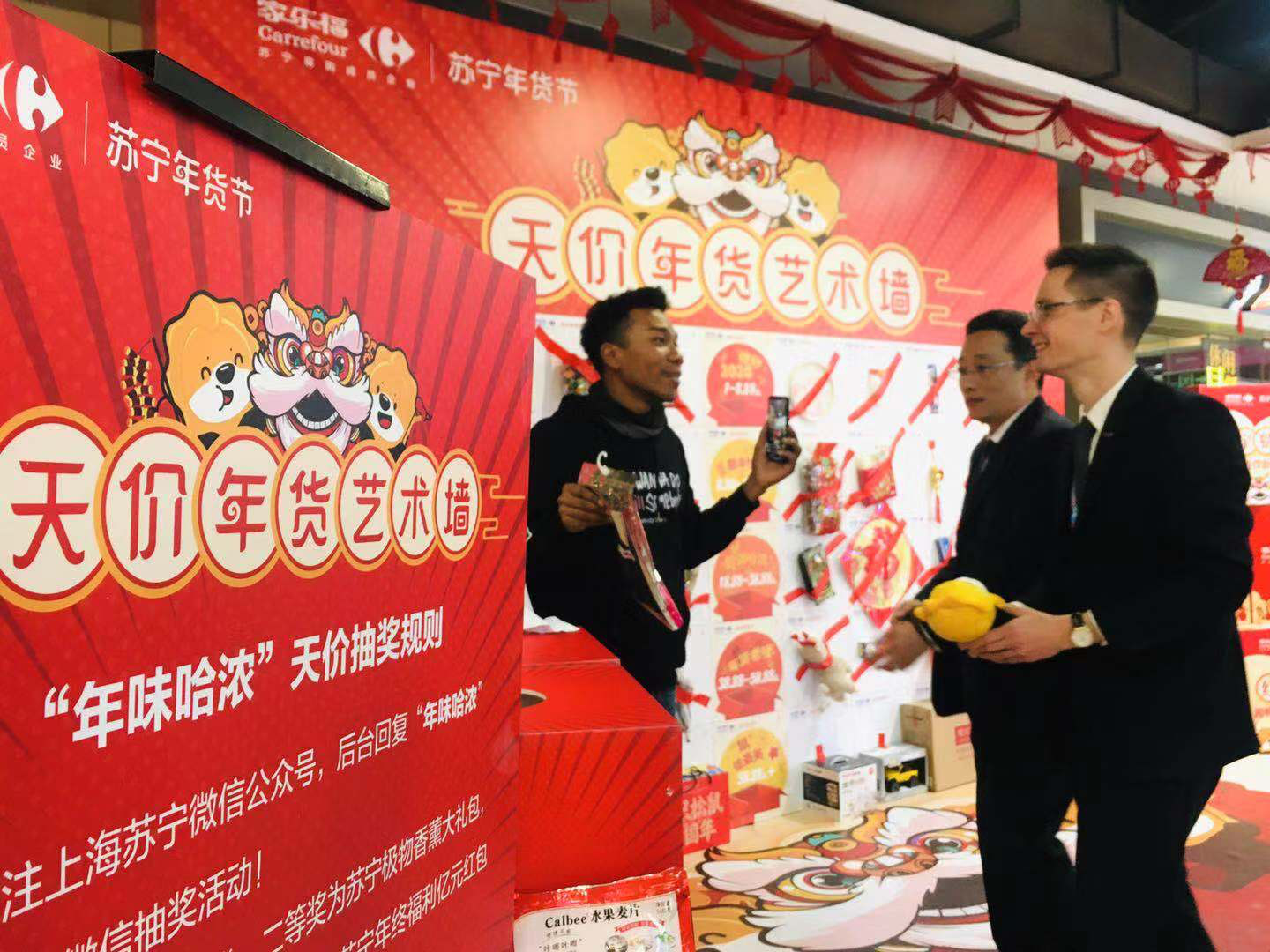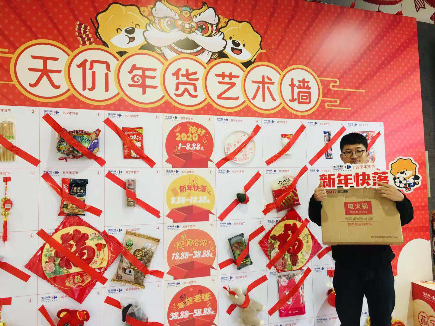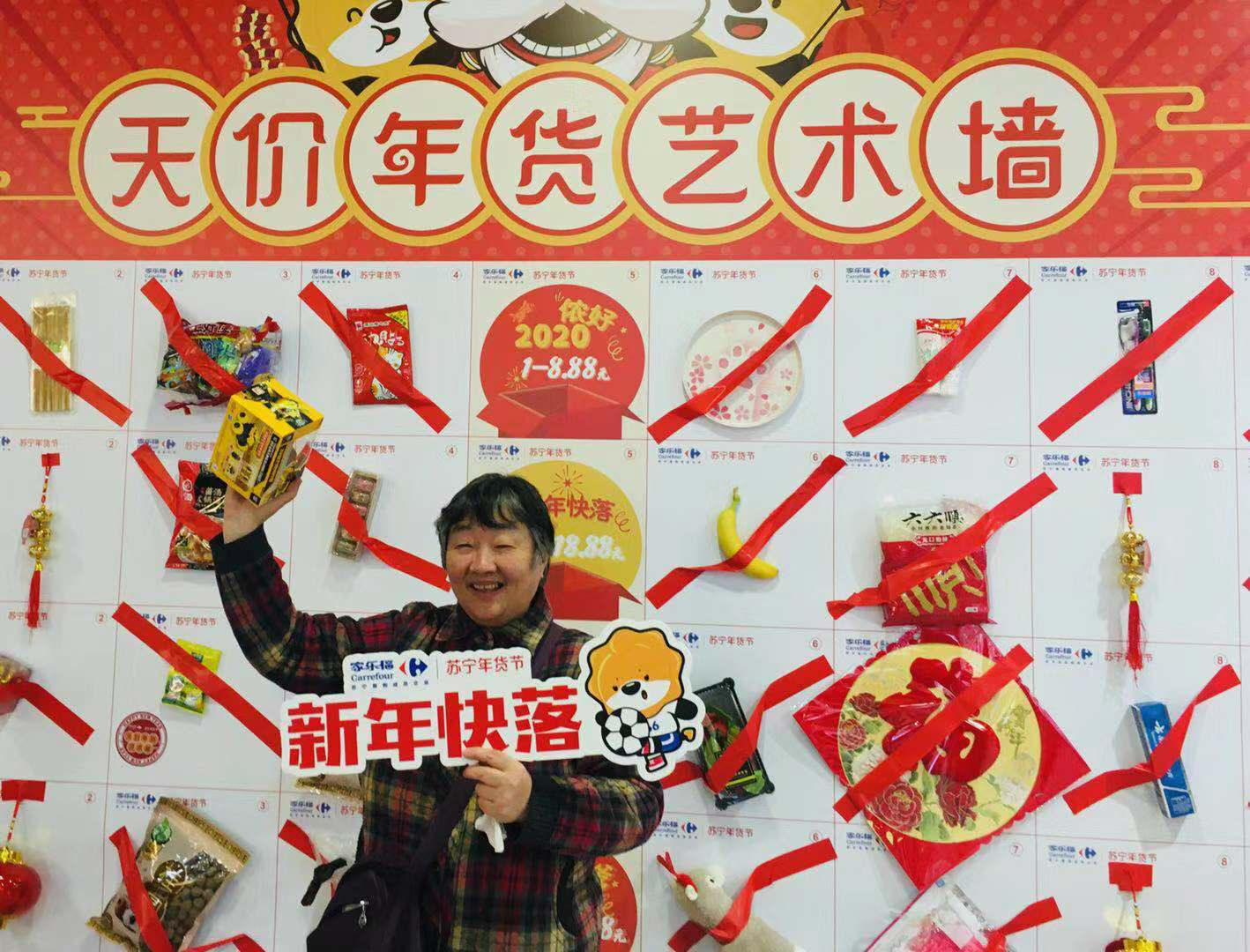 1月10日上午,記者來到家樂福“年味哈濃”天價(jià)年貨藝術(shù)墻的活動(dòng)現(xiàn)場(chǎng),眾多市民正想躍躍欲試。記者發(fā)現(xiàn),在天價(jià)年貨藝術(shù)墻上,有儂好2020、新年快落、腔調(diào)哈濃、年貨老嗲、“鼠”儂最美五類天價(jià)年貨。