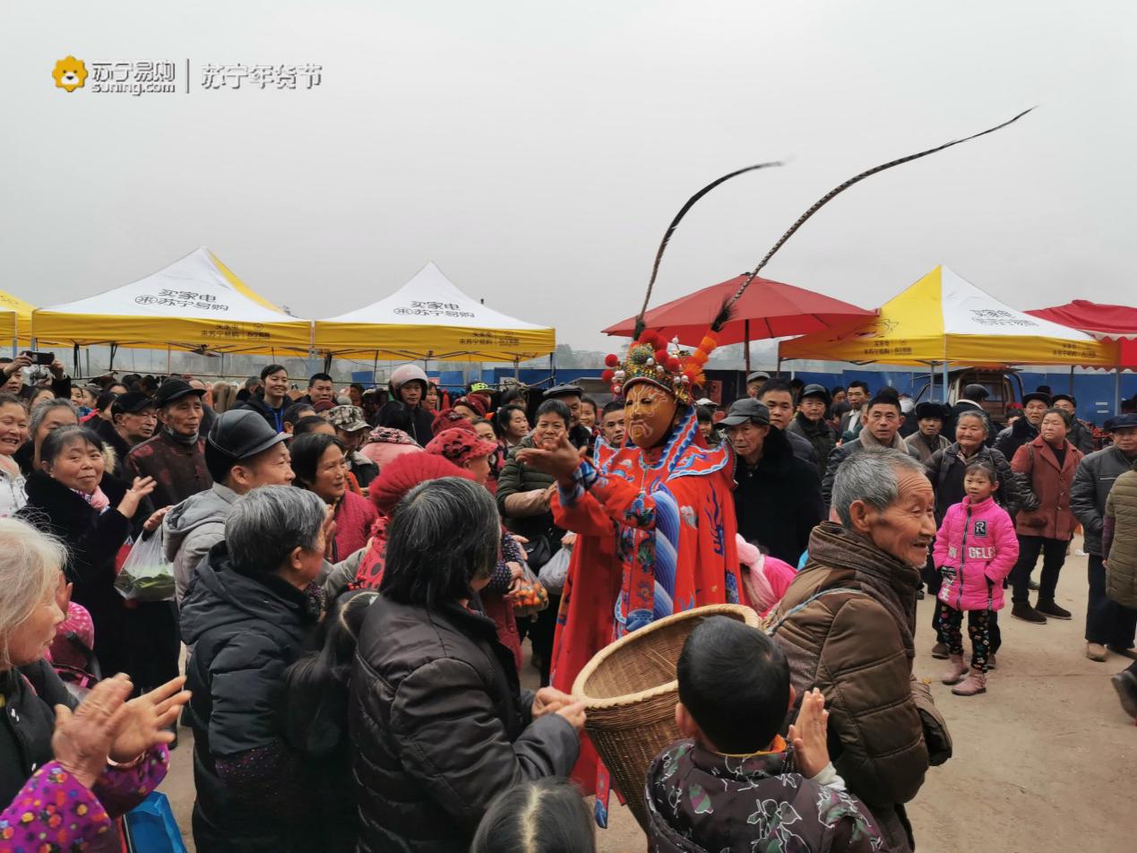 集市現(xiàn)場,品質(zhì)家電、年貨禮盒、高端酒水、以舊換新等多個專區(qū)擺滿了琳瑯滿目的商品。在正中央的主舞臺上,當(dāng)?shù)鼐W(wǎng)紅演出小品、紅包送禮、舞獅等本地化節(jié)目內(nèi)容包羅萬象,打造出下沉市場吃樂玩購一網(wǎng)打盡的年味活動。