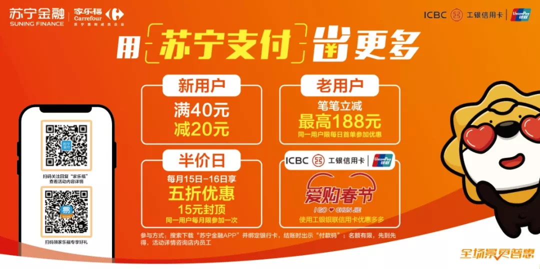 注意啦!使用蘇寧支付省更多!下載“蘇寧金融APP”并綁定銀行卡,在家樂福門店結(jié)賬時出示“付款碼”,新用戶可享滿40元減20元,老用戶筆筆立減,最高188元。每月15日至16日半價日,蘇寧支付用戶還可享五折優(yōu)惠,15元封頂。名額有限,先到先得。