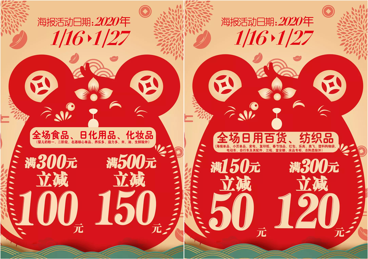 1月16日至1月27日,家樂福華南區(qū)全場食品、日化用品、化妝品滿300元立減100元,滿500元立減150元;全場日用百貨、紡織品(除家電)滿150元立減50元。