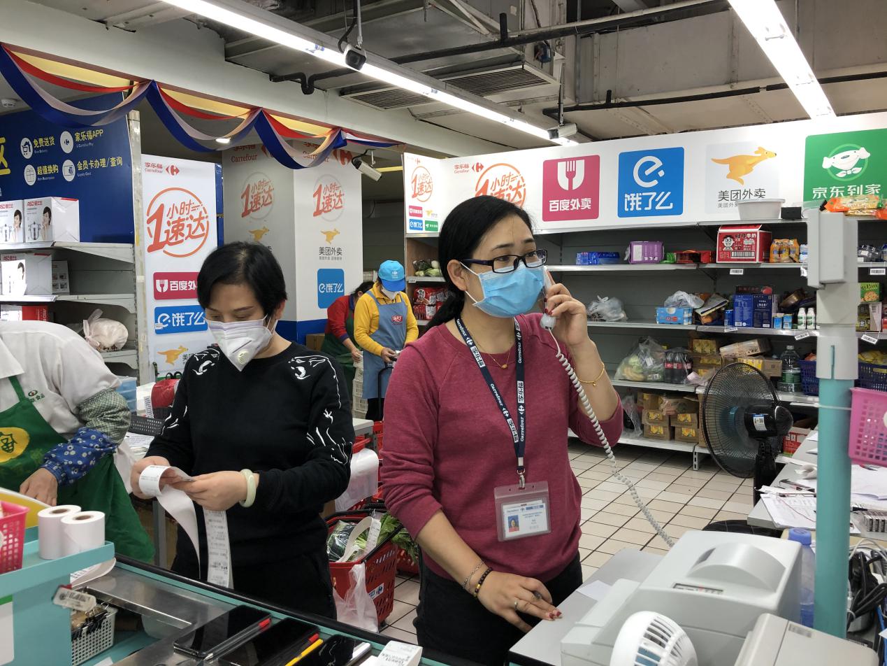 “最近十幾天,我們每天都要工作12個(gè)小時(shí)以上。”說(shuō)這話(huà)的正是家樂(lè)福深圳梅林店的電商主管王立華,由她帶領(lǐng)的5人小團(tuán)隊(duì)肩負(fù)起該店“配送到家”服務(wù)的揀貨、核單、打包、確認(rèn)、與騎手交貨等工作。疫情當(dāng)前為避開(kāi)人群,更多的市民選擇在線上外賣(mài)平臺(tái)訂購(gòu)超市的商品配送到家,因此超市的線上訂單猛增。為了實(shí)現(xiàn)“1小時(shí)速達(dá)”的承諾,避免訂單超時(shí),王立華要求團(tuán)隊(duì)從出單到打包好不能超過(guò)20分鐘,每天過(guò)手的各類(lèi)商品有上千件?!凹覙?lè)福梅林店的賣(mài)場(chǎng)面積大概是5000平方米,每天上下樓跑多少趟具體倒是沒(méi)有統(tǒng)計(jì)過(guò),但像現(xiàn)在特殊時(shí)期,我們一天在網(wǎng)上接到的‘配送到家’服務(wù)訂單基本都要超過(guò)800單,有時(shí)候會(huì)到1000單?!蓖趿⑷A回答記者時(shí),額頭上一直有細(xì)密的汗珠,聲音也有點(diǎn)沙啞了。