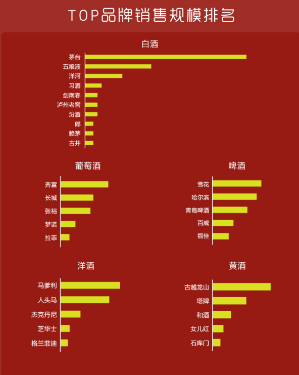 具體來說,從蘇寧超市公布的品牌銷售規(guī)模排行榜來看,茅臺、五糧液、洋河、習(xí)酒、劍南春、瀘州老窖、汾酒、郎酒、賴茅、古井成為當之無愧的白酒品類銷售top10品牌。奔富、長城、張裕、夢諾、拉菲則成功問鼎葡萄酒銷售top5,雪花、哈爾濱、青島、百威、福佳在啤酒品類中銷售表現(xiàn)最好。馬爹利、古越龍山則分別成為洋酒、黃酒品類銷售冠軍。