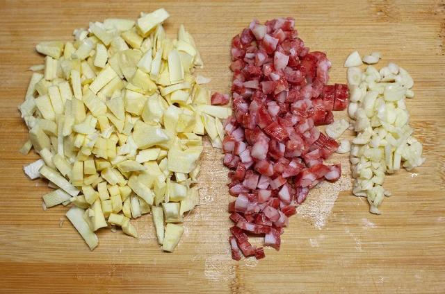 2.雪菜多洗幾遍,避免太咸;筍、臘腸、蒜頭切小??;筍丁焯一下水去除澀味。