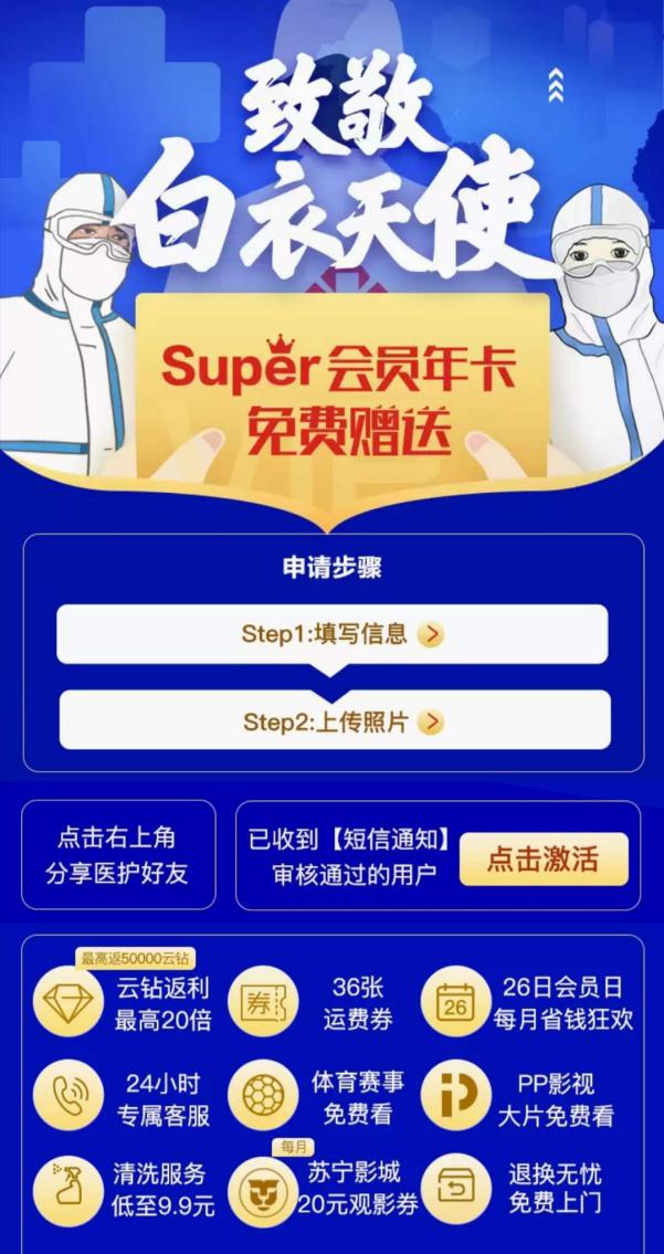 3月30日,蘇寧宣布加碼此次活動(dòng),Super會(huì)員贈(zèng)送對象不僅包括具備執(zhí)業(yè)資格證書的醫(yī)生和護(hù)士,還包括藥師和技師,藥師和技師包含不限于放射影像科技師、檢驗(yàn)科技師、口腔科技師、藥劑師、康復(fù)治療師等。消息發(fā)布后,藥師申請人數(shù)日均環(huán)比增長達(dá)89%,技師申請人數(shù)日均環(huán)比增長達(dá)145%。醫(yī)院行政、公共衛(wèi)生醫(yī)師、感染管理、海關(guān)衛(wèi)生檢疫人員、救護(hù)車駕駛員、心理治療師、醫(yī)院信息科工程師等人員也紛紛遞交申請。