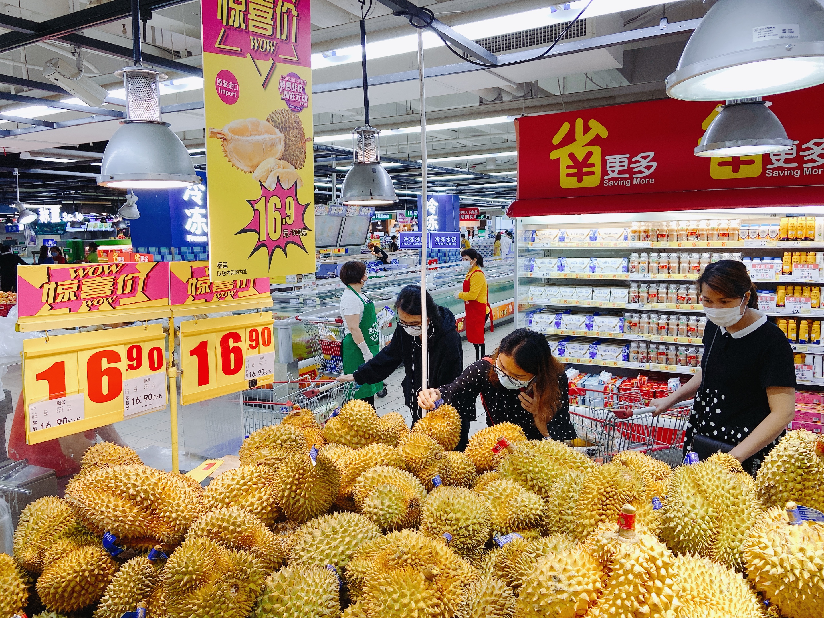 4月19日,記者來到家樂福一門店實地探訪。剛一步入生鮮區(qū)域,便被“泰國進(jìn)口榴蓮,白菜價16.9一斤”的促銷口號所吸引。整個生鮮區(qū)不乏各色接地氣的促銷口號,吆喝聲此起彼伏,吸引不少消費者駐足選購?!皠偵鲜械奶﹪鹫眍^,你看這個個頭、還有這個味道你聞聞,(每斤)只要16.9,比我們小區(qū)附近的生鮮超市還便宜”,一位受訪者對高性價比的泰國榴蓮贊不絕口。此次探店,記者聽到消費者最多的反饋是“品質(zhì)更好了,品種更多了”。家樂福深諳消費者的需求,想要促進(jìn)消費,首先要給消費者提供更多更好的選擇。“我們這次推出的’四月品鮮季’活動,有來自泰國、菲律賓等東南亞國家的反季水果,也有來自巴西、湖北的水產(chǎn)肉類。16.9元一斤的泰國金枕榴蓮、4.9元一斤的菲律賓切割蕉、25.9元一斤的湖北清水稻田蝦這幾天一直占據(jù)暢銷榜前三的位置”,該店負(fù)責(zé)人介紹。