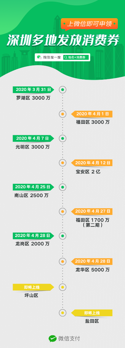 見(jiàn)圳客戶(hù)端·深圳新聞網(wǎng)2020年4月28日訊 今日,深圳龍華區(qū)、龍崗區(qū)宣布聯(lián)合微信發(fā)放5000萬(wàn)元和2000萬(wàn)元電子消費(fèi)券,同時(shí)福田區(qū)也在昨天開(kāi)啟了第二期1700萬(wàn)元的消費(fèi)券發(fā)放活動(dòng)。截至今日,深圳市羅湖區(qū)、福田區(qū)、光明區(qū)、寶安區(qū)、南山區(qū)、龍華區(qū)、龍崗區(qū)均通過(guò)微信平臺(tái)發(fā)放了電子消費(fèi)券,總金額超4億元。