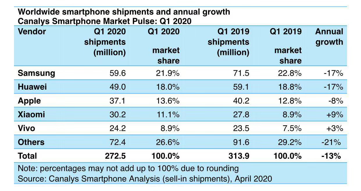 另一家國際權(quán)威機(jī)構(gòu)Canalys也在今天發(fā)布了今年一季度全球智能手機(jī)的出貨量報告,前五大手機(jī)廠商的排名和IDC的報告一樣。該報告顯示,今年一季度全球智能手機(jī)出貨量受新冠疫情影響下降13%,而vivo在重回前五的同時,全球出貨量逆勢同比增長3%。