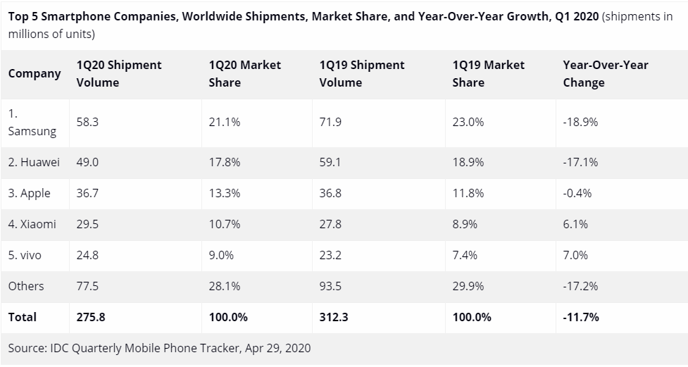 見圳客戶端·深圳新聞網(wǎng)2020年5月6日訊 國際權(quán)威機(jī)構(gòu)IDC最新報告顯示,全球智能手機(jī)出貨量在2020年第一季度同比下降11.7%。其中,三星、華為、蘋果依舊穩(wěn)居前三,分別為21.1%、17.8%和13.3%。