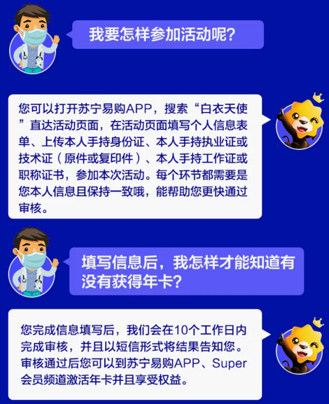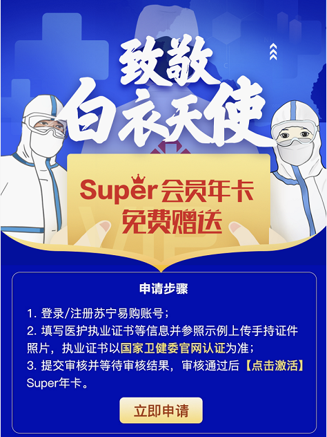 為表達對醫(yī)護工作者的敬意,蘇寧對全國醫(yī)護人員開放SUPER會員免費申領(lǐng)活動。