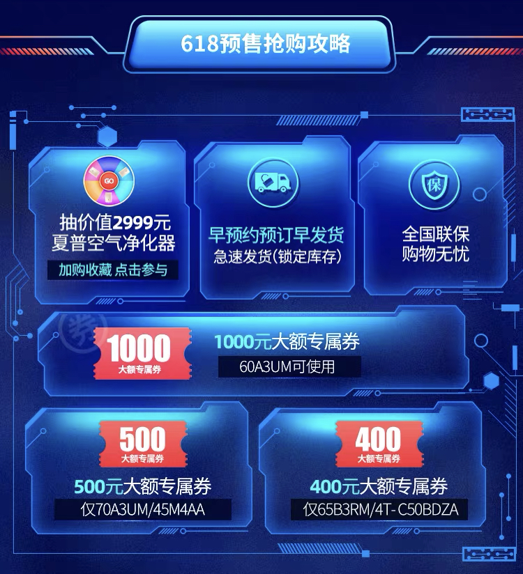 本消費(fèi)者參與預(yù)付,100元定金膨脹最高達(dá)1.5倍,滿滿誠意助力預(yù)售。此外若消費(fèi)者參與搶先付定,還能獲得最高價值1199元的專屬大禮包,包含從夏普音響到優(yōu)酷年卡在內(nèi)7重好禮助力預(yù)售!優(yōu)惠之外,夏普還驚喜設(shè)置加購收藏環(huán)節(jié),消費(fèi)者參與抽獎即有機(jī)會獲得高達(dá)2999元的超實(shí)用夏普空氣凈化器。更多大促信息可前往天貓夏普官方旗艦店了解詳盡618預(yù)售搶購攻略。