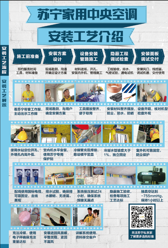 蘇寧中央空調(diào)以《安裝綠寶書》的形式,從“人、材、技”三方面規(guī)定蘇寧施工“365標(biāo)準(zhǔn)”,細(xì)致展示了蘇寧中央空調(diào)的施工流程和具體工藝,包括安裝工程師的職業(yè)行為、施工現(xiàn)場的規(guī)范、安裝工具的要求、安裝材料的標(biāo)準(zhǔn),以及整個安裝過程的嚴(yán)苛工藝標(biāo)準(zhǔn)和調(diào)試環(huán)節(jié)等諸多方面。五大工序,涉及18個步驟,為消費者全面解讀中央空調(diào)標(biāo)準(zhǔn)化施工的“秘密”。