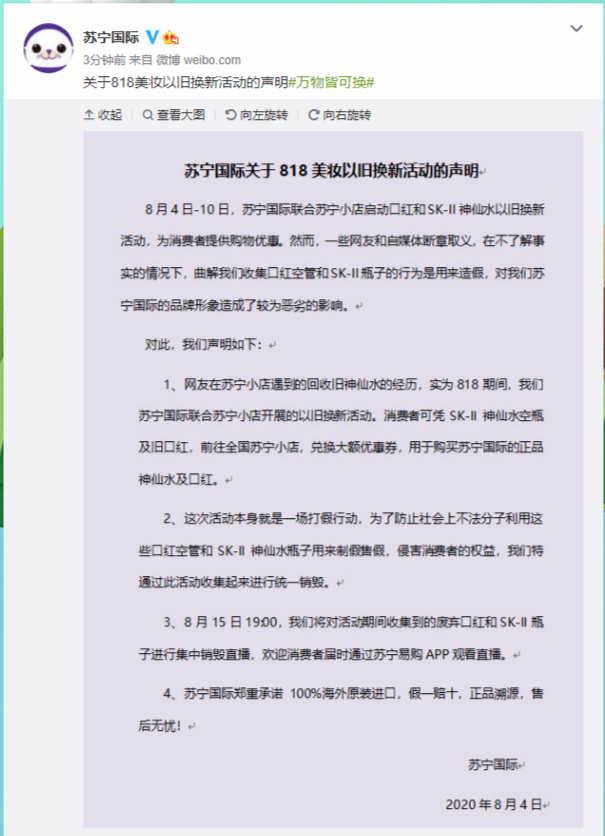 “我們的活動(dòng),原本是為了防止社會(huì)上不法分子,利用這些口紅空管和神仙水瓶子用來制假售假,侵害消費(fèi)者的權(quán)益,沒想到會(huì)被部分網(wǎng)友曲解。希望消費(fèi)者都能理性思考,獨(dú)立判斷,勿信謠傳謠?!碧K寧國際相關(guān)負(fù)責(zé)人表示。
