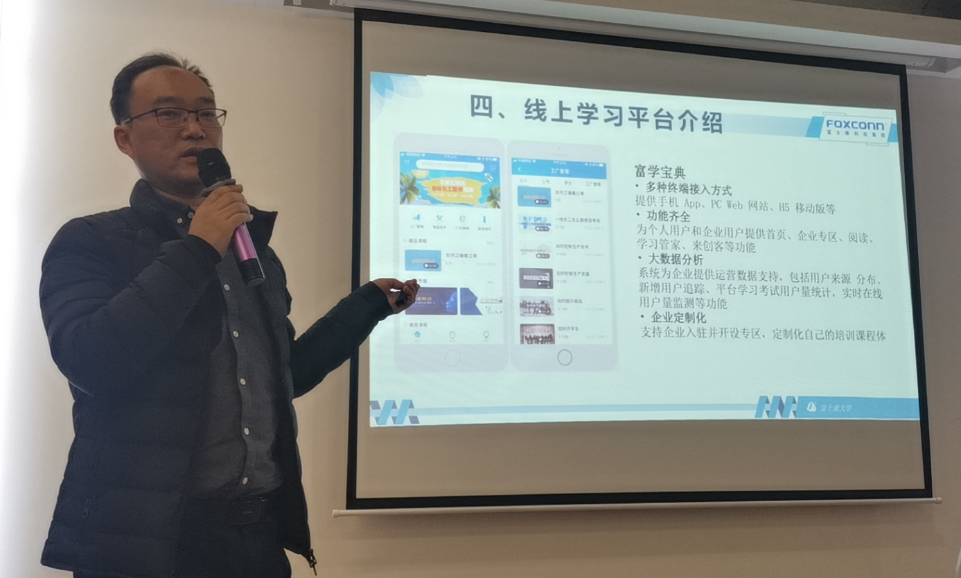 富士康大學(xué)資深專理李治佑帶來了適崗培訓(xùn)補(bǔ)補(bǔ)貼的專項(xiàng)解決方案,李專理表示,富士康大學(xué)會(huì)開放更多的課程資源,賦能富友制造企業(yè),促進(jìn)灣區(qū)制造企業(yè)筑基升級(jí)。