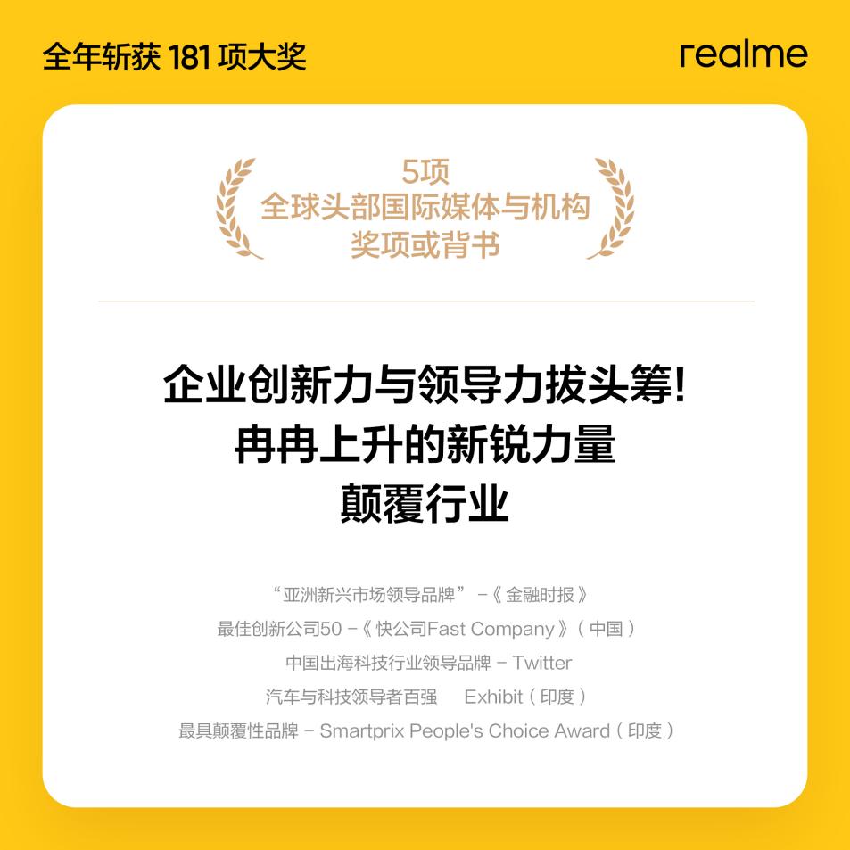 2020年,realme在全球斬獲了17個(gè)企業(yè)和品牌維度的獎(jiǎng)項(xiàng),企業(yè)創(chuàng)新力與領(lǐng)導(dǎo)力獲得業(yè)界認(rèn)可。國(guó)際權(quán)威媒體《金融時(shí)報(bào)》肯定了realme在亞太地區(qū)的領(lǐng)先地位。Financial Times、快公司、Twitter、Exhibi等媒體與機(jī)構(gòu)授予realme“亞洲新興市場(chǎng)領(lǐng)導(dǎo)品牌”、“最佳創(chuàng)新公司50”、“中國(guó)出??萍夹袠I(yè)領(lǐng)導(dǎo)品牌”、“汽車與科技領(lǐng)導(dǎo)者百?gòu)?qiáng)”以及“最具顛覆性品牌”五項(xiàng)大獎(jiǎng)。realme品牌潛力不斷釋放,業(yè)界普遍認(rèn)為,在過(guò)去的一年里,realme品牌的增勢(shì)強(qiáng)勁,全球品牌價(jià)值在不斷躍升。