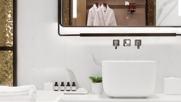 夜幕降臨,賓客可慵懶地置身浴缸之中,閉目享受由B&O音響帶來(lái)的音樂(lè)廳般沉浸式體驗(yàn)。或從飄臺(tái)取過(guò)剛剛煮好的香茗,讓茶香雅韻充盈唇齒。酒店備好的浴品套裝,將讓賓客從發(fā)絲到肌膚,皆浸潤(rùn)于LE LABO的香氛宇宙,奢寵體驗(yàn)無(wú)與倫比。