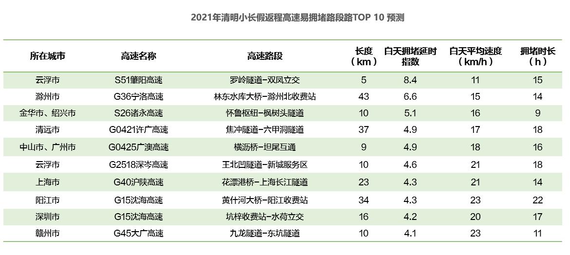具體時段方面,預(yù)計2021年4月2日(清明小長假前一天)15時開始,全國高速交通壓力逐漸增大,20時至23時擁堵程度較高;4月3日(清明小長假第一天)8時至12時高速迎來出程擁堵高峰,預(yù)計10時至11時達峰值,4月5日(清明小長假最后一天)14時至19時為高速返程擁堵高峰。