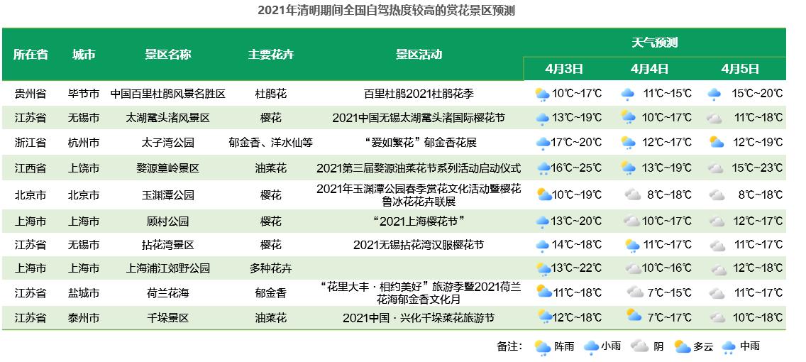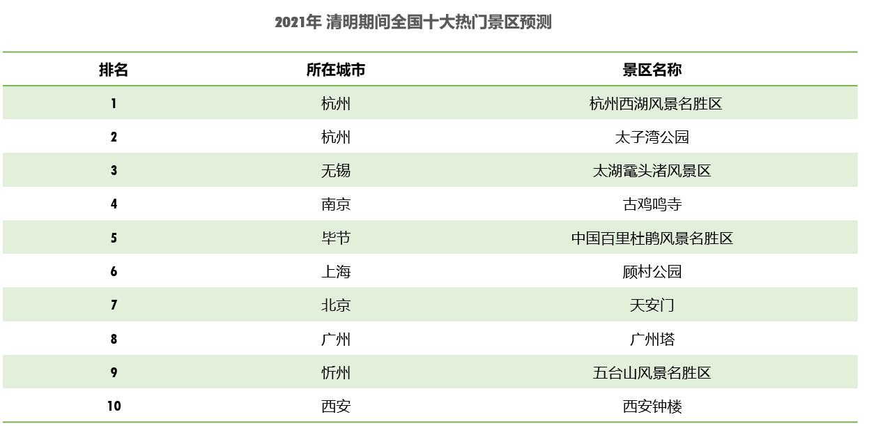 預(yù)計清明假期杭州西湖風(fēng)景名勝區(qū)最為熱門,其次為太子灣公園、太湖黿頭渚風(fēng)景區(qū)、古雞鳴寺、中國百里杜鵑風(fēng)景名勝區(qū)、顧村公園、天安門、廣州塔、五臺山風(fēng)景名勝區(qū)、西安鐘樓。