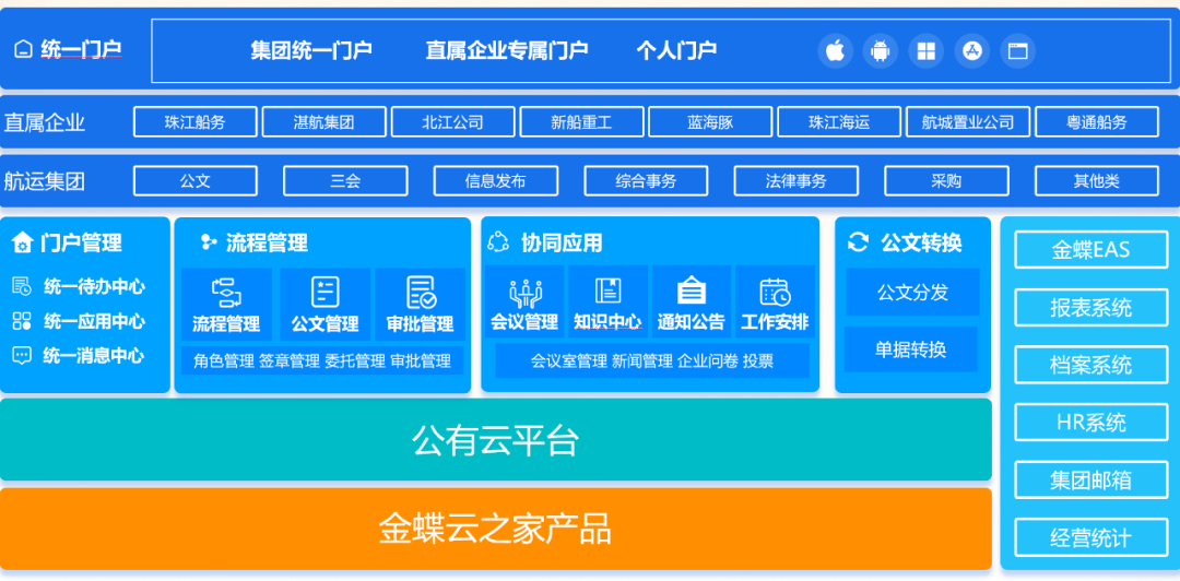 作為大型綜合性國企,廣東航運(yùn)集團(tuán)現(xiàn)有直屬企業(yè)8家,擁有全資、控股、參股及代理水路客運(yùn)港口13家,經(jīng)營和管理96艘粵港澳高速客船。伴隨經(jīng)營規(guī)模的發(fā)展、技術(shù)迭代、應(yīng)用場景深入,其信息化需要一個可以覆蓋集團(tuán)協(xié)同應(yīng)用場景的綜合辦公平臺,而集團(tuán)原有的OA已經(jīng)無法滿足航運(yùn)的持續(xù)發(fā)展需要。