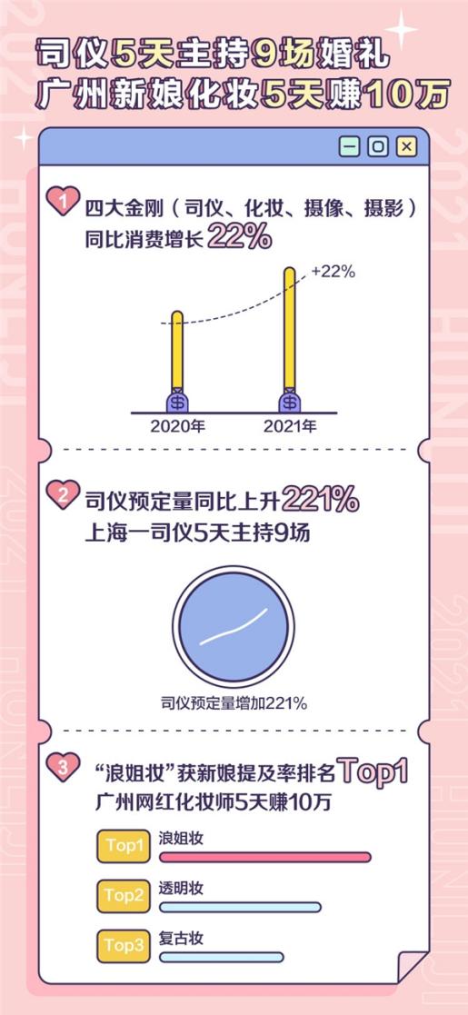 “快要忙瘋了,五一5天辦了150多場(chǎng)婚禮,第一天就有60場(chǎng),去年這時(shí)候婚禮只有個(gè)位數(shù),今年我們員工都加班加點(diǎn)連夜趕工搭建場(chǎng)地?!被槎Y紀(jì)商家Sunny喜鋪婚禮副總趙佳佳在接受采訪的時(shí)候表示,不僅商家忙,新人也非常忙,Z世代的新人都習(xí)慣于通過(guò)線上咨詢、直播下單等互聯(lián)網(wǎng)形式進(jìn)行婚禮消費(fèi),省去了線下奔波的時(shí)間。