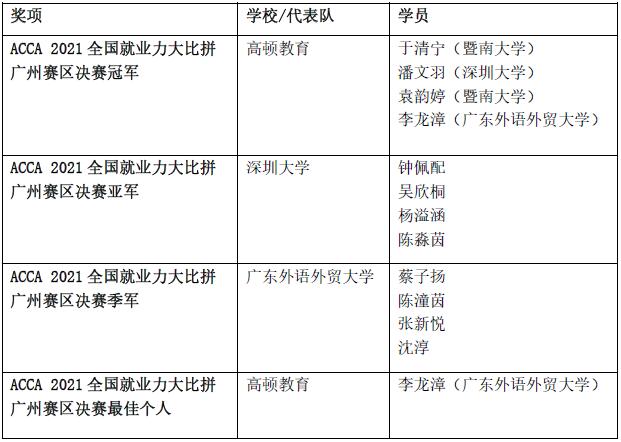 經(jīng)過4小時的激烈角逐,在評委的嚴格評選下,來自高頓教育、深圳大學和廣東外語外貿(mào)大學代表隊的同學獲得本次區(qū)域決賽的冠、亞、季軍。其中,冠、亞軍隊伍將于7月16日,代表廣州賽區(qū)出戰(zhàn)ACCA2021全國就業(yè)力大比拼總決賽,與國內(nèi)其他區(qū)域的優(yōu)秀隊伍同臺競技。