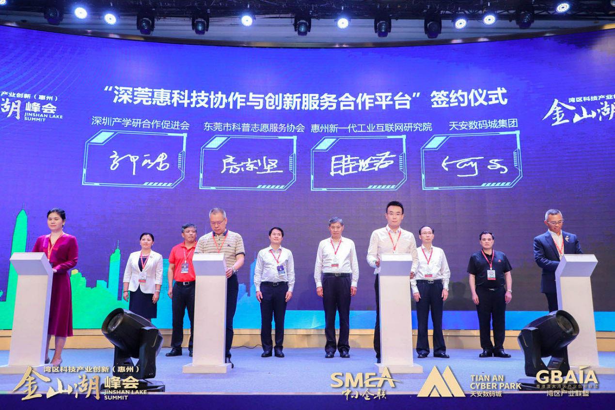 峰會(huì)當(dāng)天,在廣東省科學(xué)技術(shù)協(xié)會(huì)黨組書(shū)記鄭慶順,惠州市委常委、市政府常務(wù)副市長(zhǎng)何廣延,深圳市科學(xué)技術(shù)協(xié)會(huì)黨組書(shū)記林祥,東莞市科學(xué)技術(shù)協(xié)會(huì)一級(jí)調(diào)研員李小兵,惠州市科學(xué)技術(shù)協(xié)會(huì)黨組書(shū)記羅金星,惠州市科學(xué)技術(shù)協(xié)會(huì)主席費(fèi)霞的見(jiàn)證下,深圳產(chǎn)學(xué)研合作促進(jìn)會(huì)郭皓、東莞市科普志愿者協(xié)會(huì)房志堅(jiān)、惠州新一代工業(yè)互聯(lián)網(wǎng)創(chuàng)新研究院眭世榮、惠州市天安數(shù)碼城有限公司何文共同上臺(tái)簽約,正式開(kāi)啟深莞惠科技協(xié)作與創(chuàng)新服務(wù)新篇章。