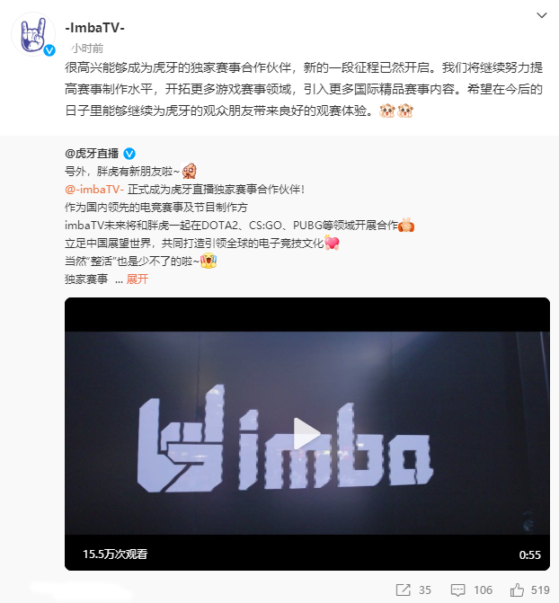 虎牙imbaTV攜手合作深耕核心電競(jìng)游戲賽事