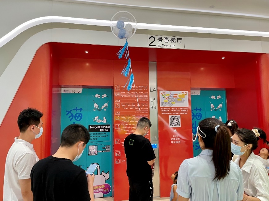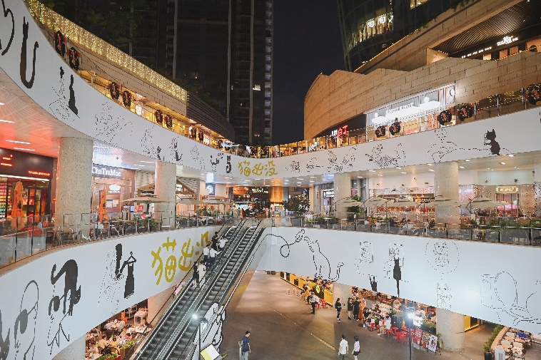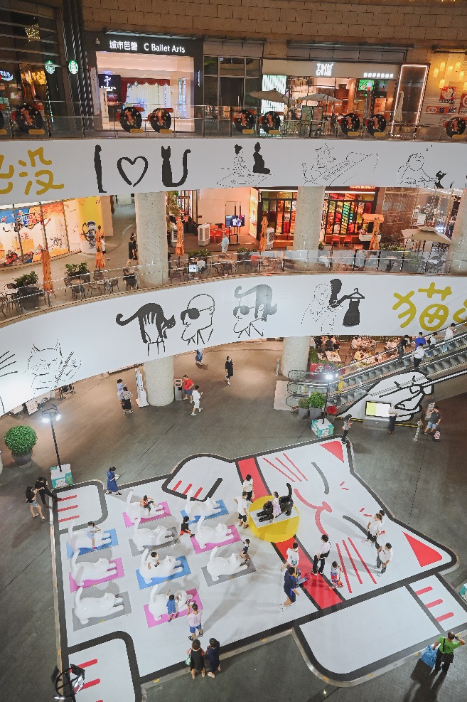 以壹方城為大型展廳,打造巨型貓瑜伽互動點(B1中心廣場)及巨型漫畫打卡墻 (小米通道前 ),全場還閃現(xiàn)各種創(chuàng)意貓貓漫畫貼紙,包括玻璃圍欄、店鋪櫥窗、電梯門,甚至是小小垃圾桶也有細(xì)節(jié)設(shè)計,沉浸式的“吸貓”逛展體驗,讓人獲得滿滿療愈之感。不得不說,貓出沒 ·tango藝術(shù)特展實屬匠心之作,氛圍感和體驗感極佳。