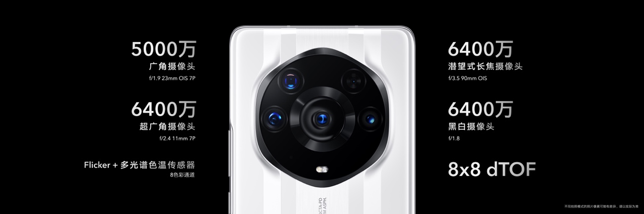 影像方面,榮耀Magic3至臻版打破手機鏡頭天花板,突破性地采用了多主攝設(shè)計。在與榮耀 Magic3 Pro采用同樣的業(yè)界領(lǐng)先6400萬潛望式長焦鏡頭和6400萬黑白鏡頭基礎(chǔ)上,榮耀 Magic3至臻版將5000萬像素超大底主攝升級為索尼 IMX700,傳感器尺寸達到1/1.28英寸,擁有業(yè)界領(lǐng)先的感光度(ISO),成像解析力、暗光拍攝能力更強。而超廣角微距鏡頭,也從1300萬像素,升級為業(yè)界領(lǐng)先的6400萬像素126°超大廣角微距鏡頭,能完美呈現(xiàn)廣闊空間中整個建筑、地標(biāo),亦能捕捉2.5cm近距離下的微小細(xì)節(jié),提供肉眼無法看到的創(chuàng)意視角。多主攝計算攝影,實現(xiàn)多焦段高清影像。