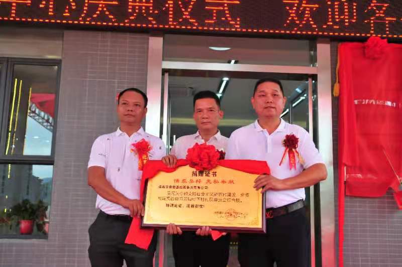 在落成典禮中,深圳安宏基控股集團(tuán)有限公司彭康輝董事將大樓辦公鑰匙移交給硁下村黨支部書記彭志康。村支書彭志康、五云鎮(zhèn)慈善會(huì)會(huì)長(zhǎng)彭志響一起贈(zèng)牌匾給深圳安宏基控股集團(tuán)有限公司彭康輝董事。