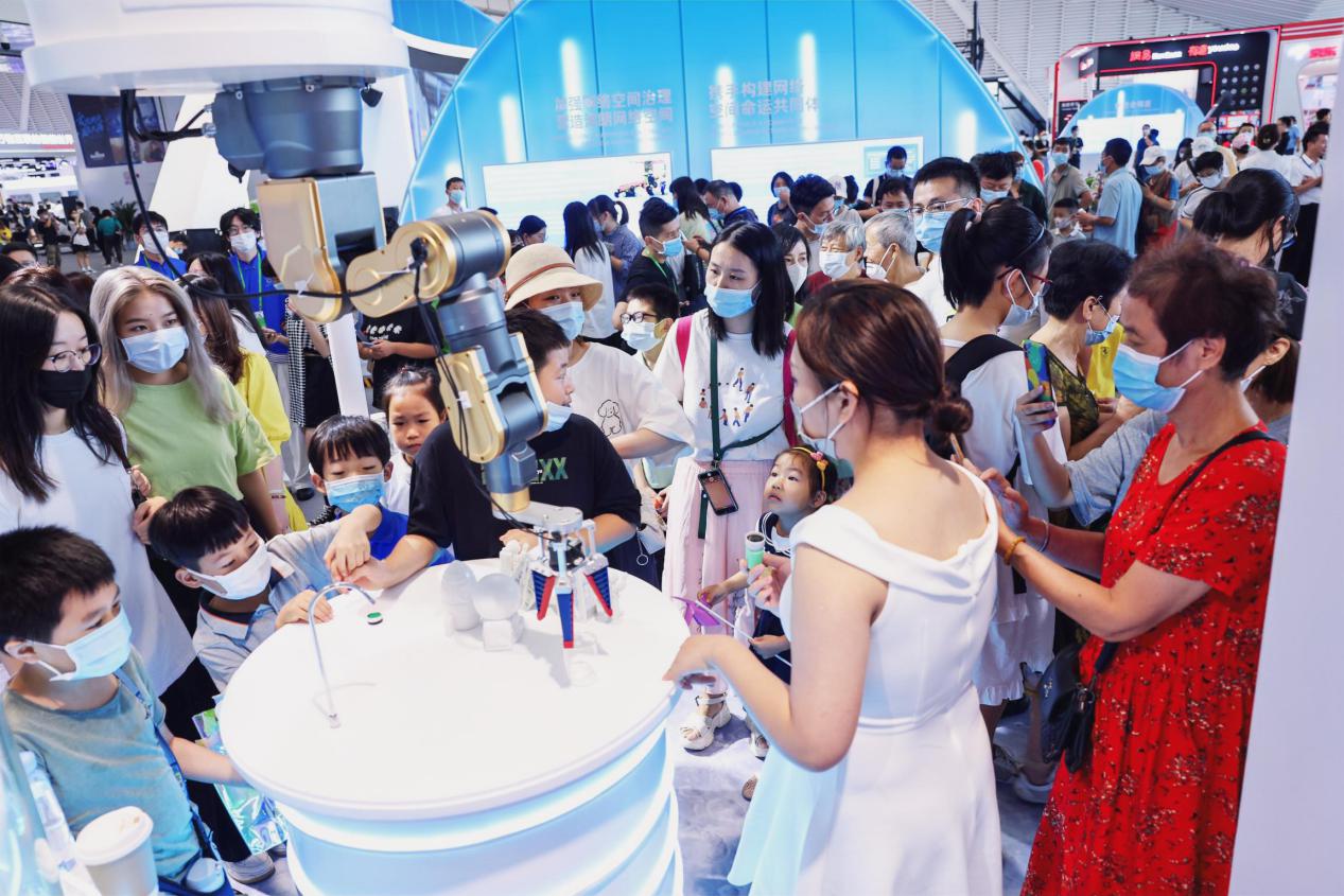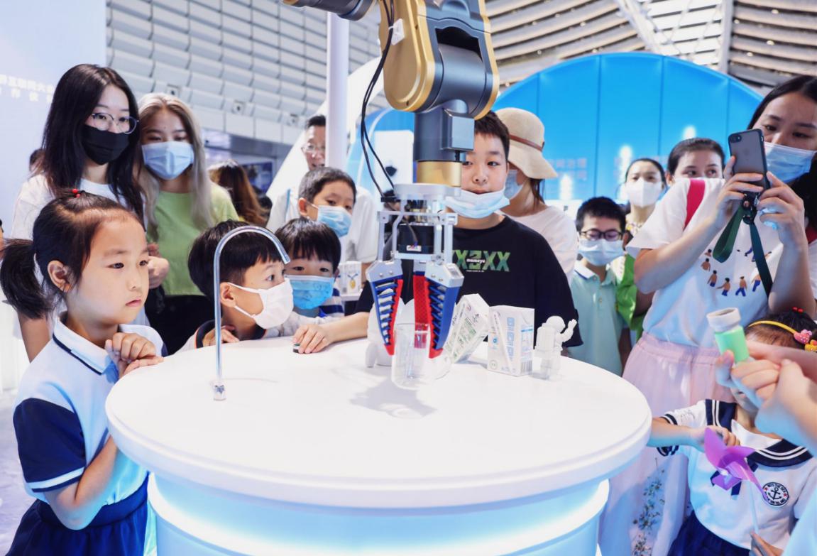 這牛奶和其他的不太一樣,很香濃?!半x心精萃‘白科技’開啟臻濃新紀(jì)元”展臺一直就是博覽會現(xiàn)場的“人氣王”,這里以宇宙探索為主題,科幻感十足,火箭發(fā)動機噴出淡淡煙霧,三臺智能機械臂不停忙碌,人們排起長隊,品嘗由“離心精萃科技”現(xiàn)場調(diào)制的伊利臻濃牛奶。在這里,吸引觀眾的不僅是美味的伊利牛奶,也有滿滿的數(shù)字科技。
