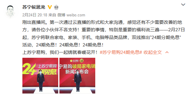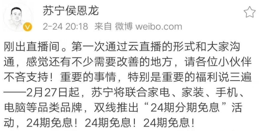 2月24日晚8點(diǎn),一場特殊的線上發(fā)布會在蘇寧矩陣直播平臺全面啟動(dòng)。蘇寧侯恩龍化身主播,宣布開啟一場公司復(fù)工與市場復(fù)蘇的“救市”行動(dòng),拉開家電銷售破局大幕。