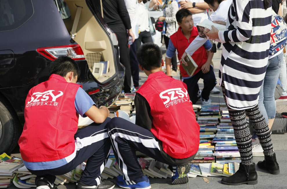 深圳市實驗中學的車尾箱展位前圍滿了前來換書的人