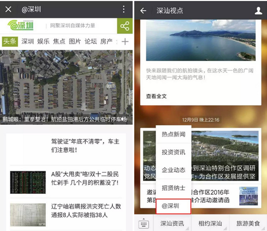 @深圳本質(zhì)是手機(jī)網(wǎng)站,可嵌入在微信公眾號(hào)底部菜單欄中(也可嵌入APP客戶端中),且其采用了最新H5編碼技術(shù),可左劃右劃更換頻道,也可上劃下劃翻看內(nèi)容,