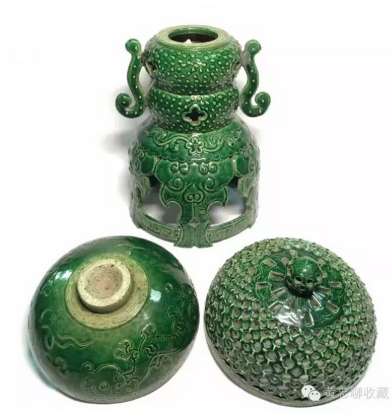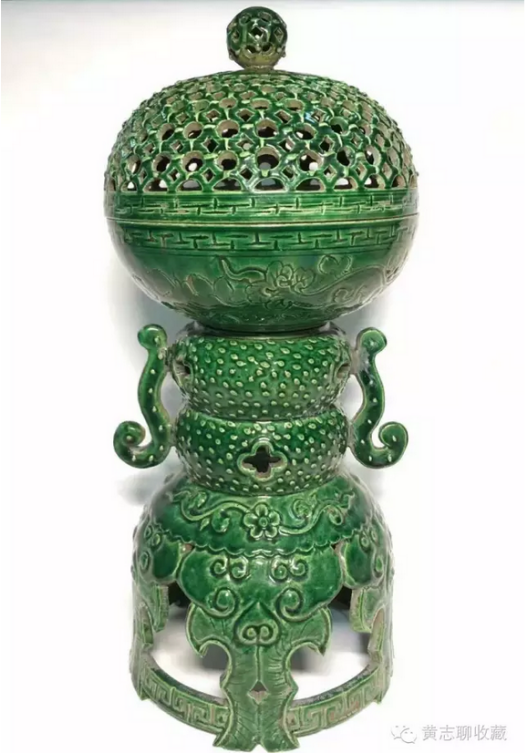 香薰在古代是頗為流行的室內(nèi)陳設(shè)用器,形制多樣,材質(zhì)不一。漢唐時期出土的香薰眾多,如有名的漢代博山爐,唐代香薰球等。兩宋時期,實行文人治國,香具更是盛行,影響所及,同時并存的遼、金兩朝也頗為風行。當然,香具中也區(qū)分宅舍用及寺廟用、宮殿用等。其中寺廟及宮殿用品多為成對擺放,講究對稱之美,顯得莊重大方。而宅舍之用更為推崇雅致,趣味。下面介紹的這件綠釉香薰應(yīng)為遼金時期的寺廟用品。 香薰高31.5cm、直徑14.5cm,整體呈豆式。豆是先秦禮器,用以在祭祀、宴饗中盛放肉食。在家廟祭祀中,豆是不可或缺的禮儀用具,早期豆用竹編成,后用青銅鑄造,因此在禮書中稱“籩豆”。此對香薰延續(xù)了青銅豆的大體形制,上作球形,香盤半圓,蓋為鏤空半圓,扣合后渾然如一。香盤可拆卸,安插于支座上。座上部為雙扁圓狀疊壓,兩側(cè)裝飾螭龍耳;下部呈鏤空裙擺式,承以托泥,穩(wěn)重大方。通體施綠釉,釉面潤澤,純凈自然。器身點綴穿花龍紋,如意紋,加之裙擺上的龕形開光,推測為當時高等級的寺廟的佛前薰香供器。 欣賞更多藏品,歡迎瀏覽【黃志博物館】網(wǎng)站。 我們會介紹更多的收藏知識、推薦更多優(yōu)質(zhì)優(yōu)價的藏品供您了解和選擇,也歡迎您把這些分享給朋友們,讓大家一起來了解歷史文化、體會收藏的快樂!