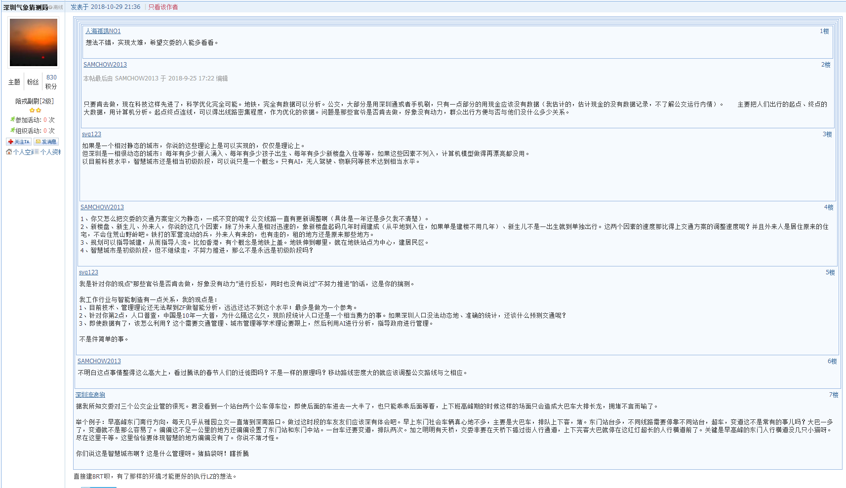9月25日有市民在深圳論壇以《關(guān)于公交線路規(guī)劃和站臺設(shè)置的一點建議》為題發(fā)帖,自稱是曾經(jīng)的公交人和現(xiàn)在的私家車駕駛員,對深圳的公交出行一口氣提出3個意見。帖文中最為吸引人眼球的觀點就是“將全市各站點進行編號,采用計算機技術(shù),對編號站點進行排列組合,每個方向連續(xù)的10個站點有三條線路覆蓋,超出三條屬于線路密度高或規(guī)劃不合理?!眴芜@一句話就在跟帖中引發(fā)了針鋒相對的辯論,有支持的市民認(rèn)為:主意不錯,實現(xiàn)起來應(yīng)該也難度不大?,F(xiàn)在不是整天提什么物聯(lián)網(wǎng)、大數(shù)據(jù)、智慧城市么,這個不就是這些高新技術(shù)在公交出行方面的應(yīng)用。不看好的市民則認(rèn)為:目前技術(shù)、管理理論還無法做智能分析,遠遠還達不到這個水平,“最多是做為一個參考”。