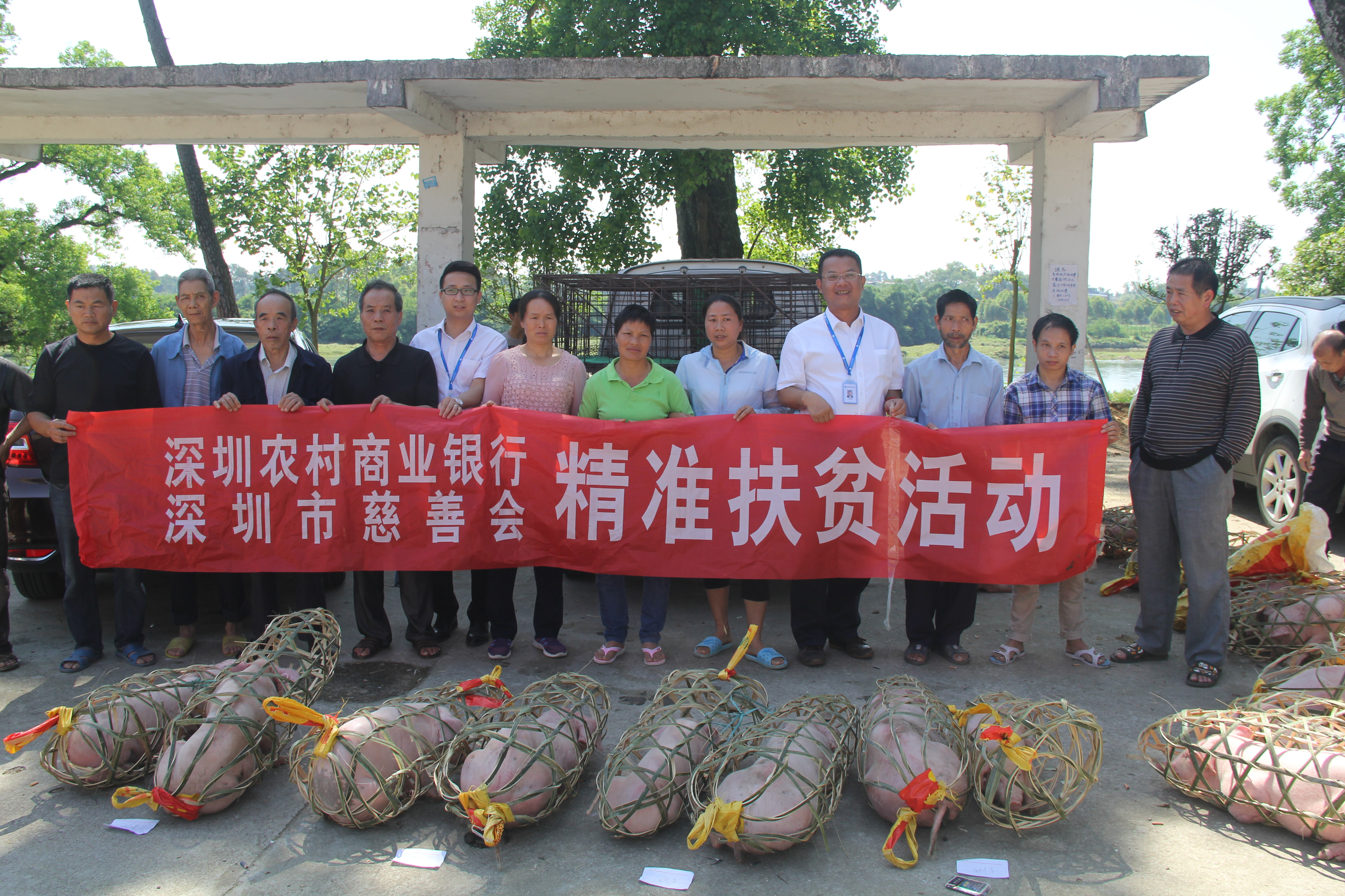 2017年,深圳農(nóng)商行的廣西6家機(jī)構(gòu)開(kāi)展了“深桂心連心”精準(zhǔn)扶貧活動(dòng),向所在地貧困戶(hù)免費(fèi)發(fā)放農(nóng)業(yè)生產(chǎn)資料,通過(guò)采購(gòu)等值的農(nóng)資(如雞、鴨、豬崽、農(nóng)作物種子與樹(shù)苗等)按戶(hù)發(fā)放給扶貧對(duì)象,待雞、鴨、豬崽和農(nóng)作物可出售時(shí)由廣西各機(jī)構(gòu)介紹銷(xiāo)售或負(fù)責(zé)回購(gòu),確保扶貧對(duì)象既能脫貧,又能提高致富能力。深桂心連心精準(zhǔn)扶貧活動(dòng),共資助了299戶(hù)貧困戶(hù),扶貧總投入為292879元。通過(guò)扶貧活動(dòng),帶動(dòng)更多的貧困戶(hù)依靠辛勤勞動(dòng),脫貧致富。