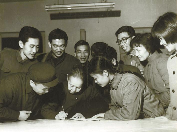 蘇曼華(右二)等人在兒童文學(xué)講習(xí)班學(xué)習(xí)時,圍著冰心先生請她簽名。(攝于1978年12月)
