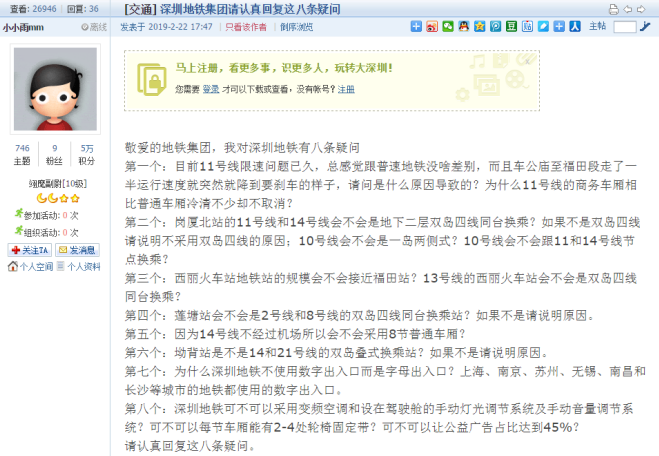 2月22日,有市民在深圳論壇發(fā)帖《敬愛的地鐵集團(tuán),我對(duì)深圳地鐵有八條疑問》,對(duì)深圳地鐵提出一系列專業(yè)且詳細(xì)的問題:“11號(hào)線限速問題由來已久”“11號(hào)線商務(wù)車廂比普通車廂冷清不少卻不取消”,對(duì)新建地鐵線路的換乘方式、14號(hào)線采用普通車廂還是商務(wù)車廂、西麗站的規(guī)模等建設(shè)方案提出疑問,并質(zhì)疑地鐵站出入口使用字母標(biāo)識(shí)而不是數(shù)字標(biāo)識(shí)是否合理。帖文中也提出了“采用變頻空調(diào)”“手動(dòng)燈光調(diào)節(jié)系統(tǒng)及手動(dòng)音量調(diào)節(jié)系統(tǒng)”“每節(jié)車廂能有2-4處輪椅固定帶”等建議,并希望“車站內(nèi)公益廣告占比要達(dá)到45%”。