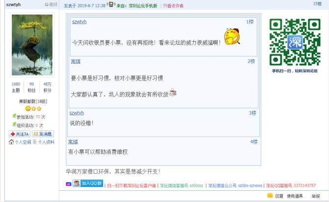 記者從問政平臺得知,5月底以來,還有市民發(fā)帖反映,除華潤萬家外,科技園萬象天地華潤Ole、僑香路沃爾瑪?shù)瘸幸泊嬖诓惶峁┘堎|(zhì)購物小票的情況。目前,市民仍然普遍認(rèn)同超市應(yīng)主動提供紙質(zhì)購物小票,避免顧客被價格欺詐。有市民表示:“遇到最多的是優(yōu)惠打折,實(shí)際還是原價買單,這時,手中有小票一目了然,不花冤枉錢。”還有市民質(zhì)疑,“奸商,動不動就打著環(huán)保這些高大上的理由作借口”。同時,也有市民體驗過微信小票后表示,“沃爾瑪手機(jī)掃碼付款是沒有紙票,購物小票藏在微信公眾號里,退換貨就在那里面進(jìn)行。這就是科技發(fā)達(dá)帶來的豐碩成果,挺好的?!苯刂劣浾甙l(fā)稿時,市民關(guān)于科技園萬象天地華潤Ole、僑香路沃爾瑪?shù)瘸胁惶峁┵徫镄∑钡奶倪€沒有得到相關(guān)部門回應(yīng)。