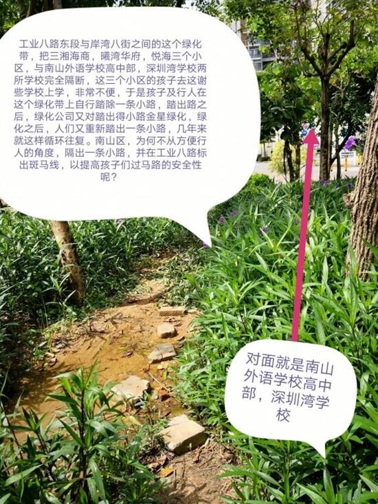 同時(shí),該市民還反映在工業(yè)八路東段與岸灣八街之間存在三個(gè)小區(qū)和兩個(gè)學(xué)校,周邊居民和孩子為了圖方便,在綠化帶上自行踏出了一條小路,綠化公司有對(duì)小路進(jìn)行綠化處理,但是處理過(guò)后,居民和孩子又會(huì)重新踏出一條,幾年來(lái)就這樣循環(huán)往復(fù)。并呼吁相關(guān)部門在此綠化帶修一條小路,在工業(yè)八路標(biāo)出斑馬線,提高孩子過(guò)馬路的安全性。