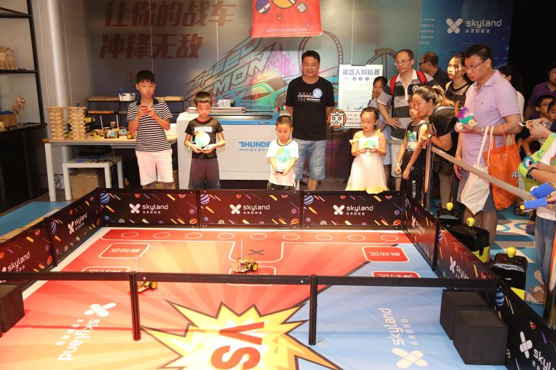 “我跟你說噢,那邊吹出來的泡泡能把我們倆都包進去!”“老媽,原來空氣的形狀是圓環(huán)形的呀……”歡聲笑語中,十幾項科技趣味項目讓小朋友們眼花繚亂、目不暇接,這其中,機器人對抗賽無疑是人氣最高的。賽場上,小朋友們分為紅藍兩隊,手持遙控器在兩側(cè)站好?!靶∨笥褌冏⒁饫?,每一位機器人身上有一個藍色燈柱,碰撞擋板被撞到后,燈柱長度會縮短……”老師一邊在“戰(zhàn)場”中擺放機器人,一邊為孩子們詳細講解規(guī)則。一聲哨響,紅藍兩隊的“機器人大戰(zhàn)”拉開了帷幕,孩子們操控著自己的戰(zhàn)車,左右閃躲,時而用一個漂亮的側(cè)移甩掉追擊者,時而全力沖擊消耗對方的“藍條”。賽場邊的家長們似乎比小選手更為緊張,他們時不時俯下身子,為孩子們出謀劃策:“小超你看,邊上那個三號車藍條快沒了,快趕過去補一下!”一位父親看到了打破僵局的好機會,急忙提醒道,小朋友則心領(lǐng)神會,熟練的操縱著機器人貼了上去……經(jīng)過一番努力,在成功拿下這寶貴的一分后,小朋友回頭與自己的老爸相視一笑,父子二人之間的默契,在這一刻體現(xiàn)的淋漓盡致。