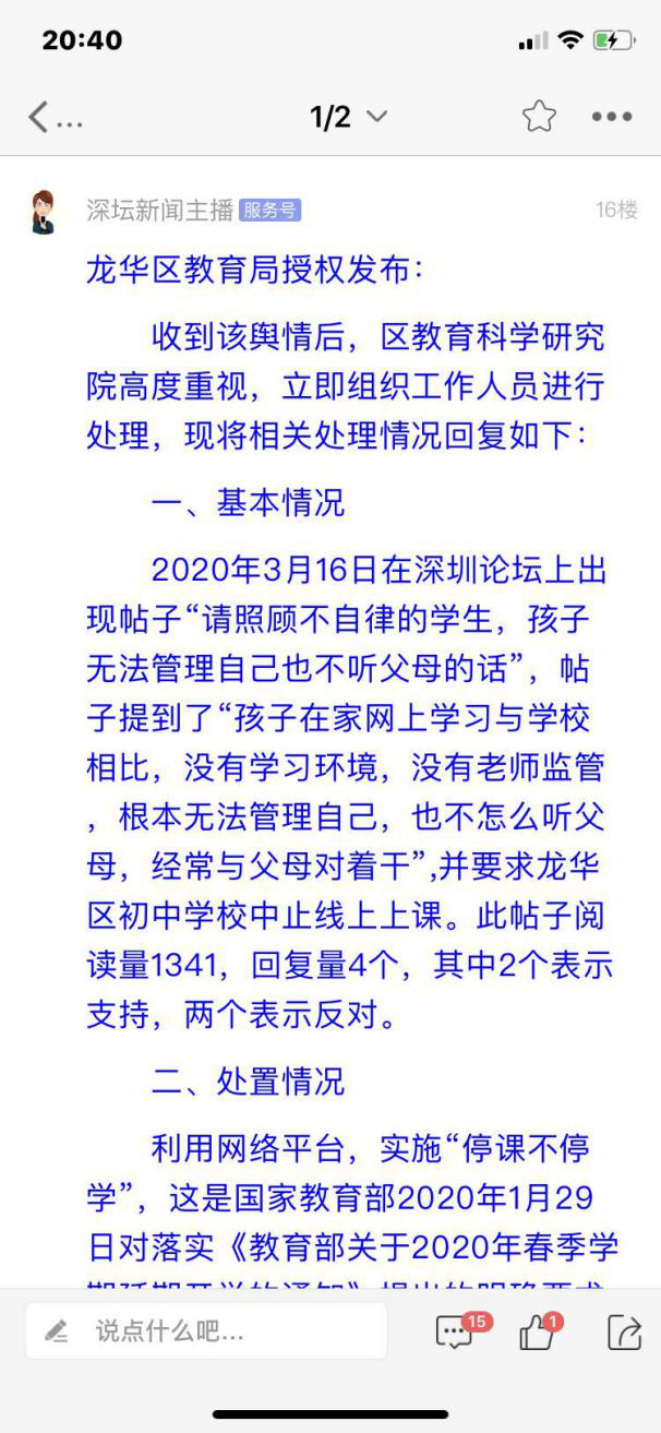 見圳客戶端·深圳新聞網(wǎng)3月25日訊 (見圳客戶端、深圳新聞網(wǎng)記者 譚銘碩)受疫情影響,深圳各中小學(xué)首次采用線上開學(xué)的方式,做到"停課不停學(xué)"。此舉讓很多深圳家長都積攢了一肚子的話,比如這位家長,就在問政深圳平臺建議龍華區(qū)終止初中網(wǎng)課,而理由居然是:"自己不在孩子身邊,孩子平時也不聽父母的話,還與父母對著干。孩子不自覺不自律導(dǎo)致在家學(xué)習(xí)效率低下?!贬槍κ忻裉岢龅膯栴},龍華區(qū)教育局在深圳論壇作出了公開回應(yīng)。