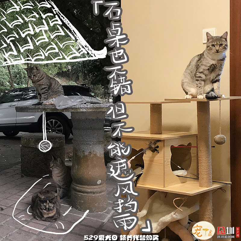 外面的世界再精彩,也比不過一個能遮風擋雨,沒有車流、毒藥威脅,三餐穩(wěn)定、四季如春的容身之處,更何況,這里還有比石桌更有趣的貓爬架和比落葉更好玩的小玩具?,F(xiàn)在“高高在上”“作威作?!钡呢堖洌彩腔ü饬艘簧羞\氣,才能在無法獨自生存的小時候,遇見一個愿意照顧TA一生的“兩腳獸”。
