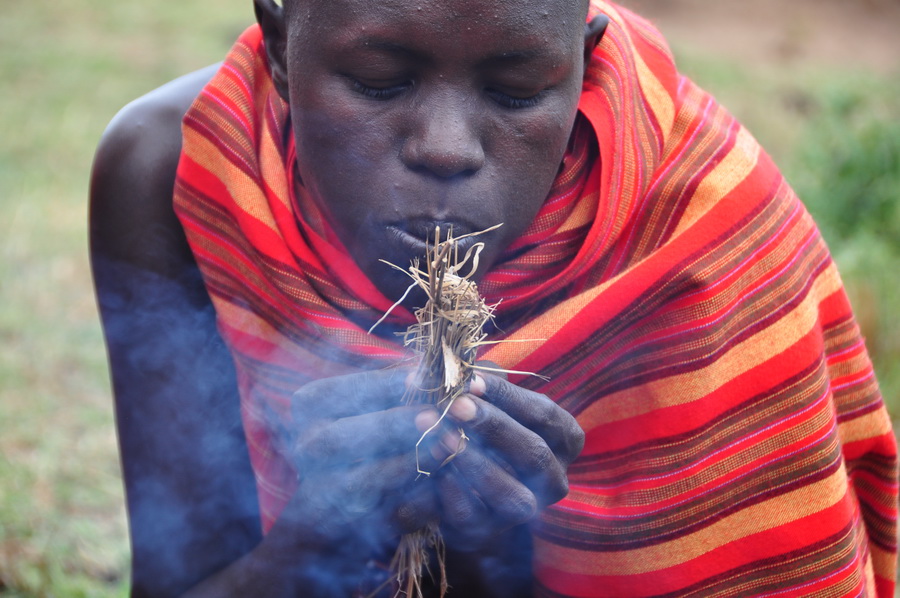 馬賽人盛行一夫多妻制。成年男子蓄發(fā)編成小辮,年輕婦女剃光頭。近年來,定居的馬賽兒童開始上學,已出現(xiàn)少數馬賽人知識分子。圖為為游客表演鉆木取火等節(jié)目的馬賽人。李仁奇 攝