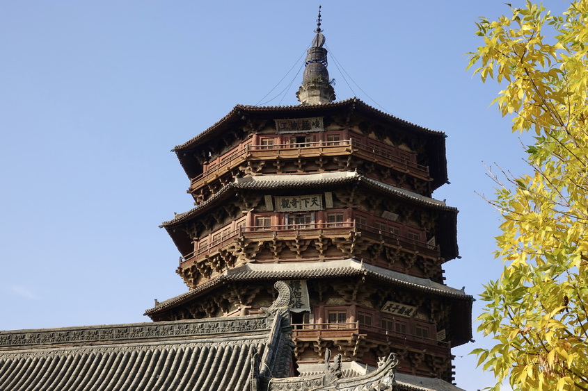 釋迦塔高67.31米,底層直徑30.27米,呈平面八角形。全塔用紅松木料3000立方米,重2600多噸,純木結(jié)構(gòu)、無釘無鉚。塔內(nèi)供奉著兩顆釋迦牟尼佛牙舍利。李仁奇攝