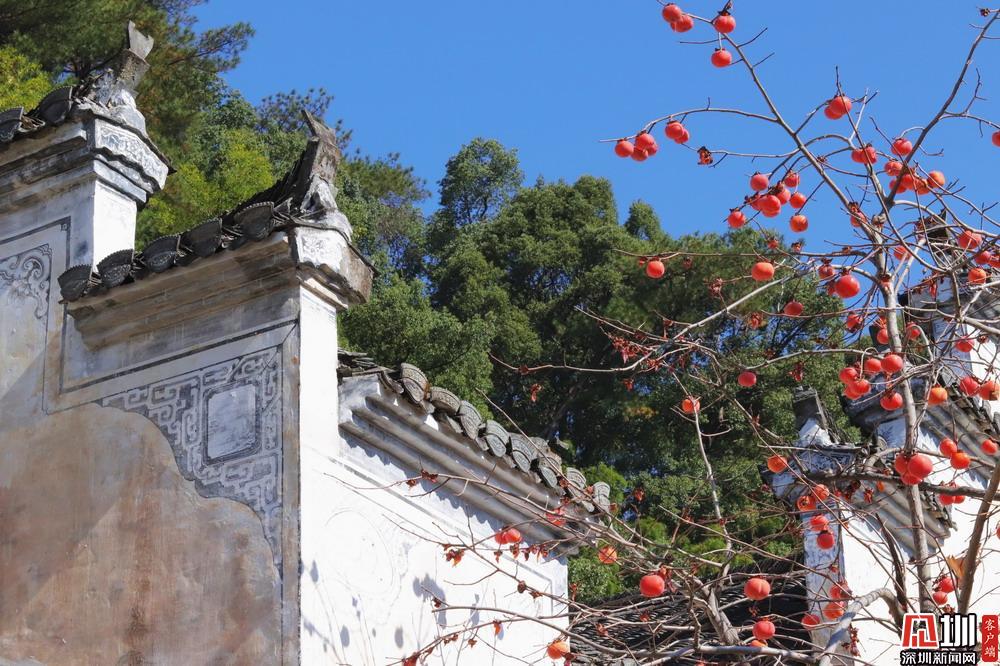 柿子熟透了,齊齊整整地掛在枝丫上,與灰瓦白墻相得益彰。