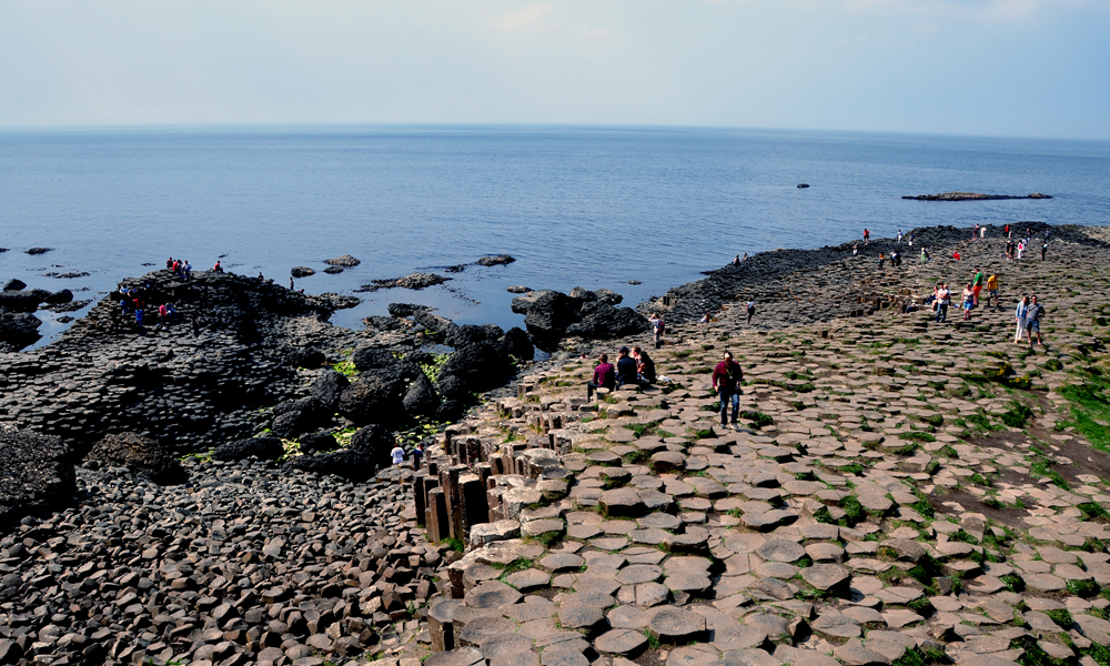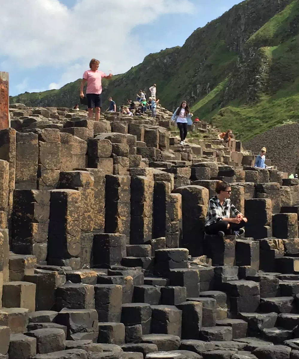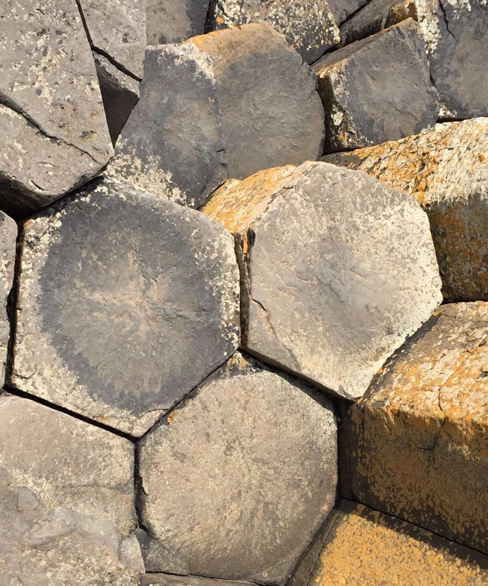 約五千萬(wàn)年前,在今天蘇格蘭西部?jī)?nèi)赫布里底群島一線(xiàn)至北愛(ài)爾蘭東部火山非常活躍,一股股玄武巖巖熔流從裂隙的地殼中涌出,隨著灼熱的熔巖冷卻收縮,結(jié)晶的時(shí)候,開(kāi)始爆裂呈規(guī)則的六邊形形態(tài)。李仁奇 攝